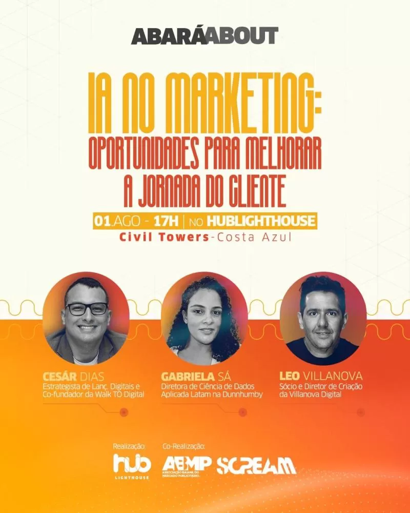 Será no dia 01 de agosto, quinta-feira, a partir das 16 horas, na sede do Hub LightHouse, no Edifício Civil Towers, no Costa Azul. Este evento, que vai reunir lideranças pioneiras no tema de IA na região, é realizado em parceria com a ABMP (Associação Baiana do Mercado Publicitário) e com o Scream Festival e vai tratar das oportunidades para melhorar a jornada do cliente através do uso, no marketing, da IA. São esperados líderes de negócios, de marketing, de inovação e outros profissionais formadores de opinião. A dinâmica contará com momentos expositivos, de debate e de networking mesclados. As inscrições são gratuitas e devem ser feitas antecipadamente através do https://www.sympla.com.br/ia-no-marketing-oportunidades-para-melhorar-a-jornada-do-cliente__2555334.
