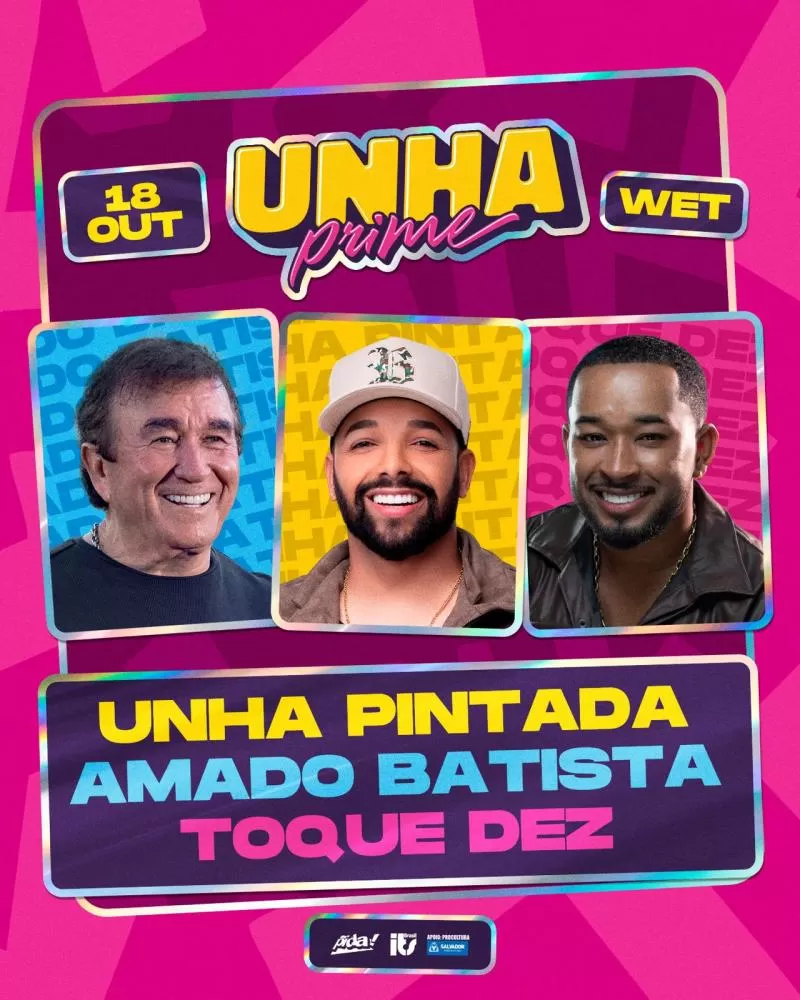 O Arrocha e o Brega vão tomar conta de Salvador! Vem aí o Unha Prime, um evento exclusivo que promete uma noite inesquecível de pura emoção, paixão e grandes sucessos do Unha Pintada. O evento acontecerá no dia 18 de outubro e o palco do Wet Salvador será tomado por três atrações que arrastam multidões por onde passam.