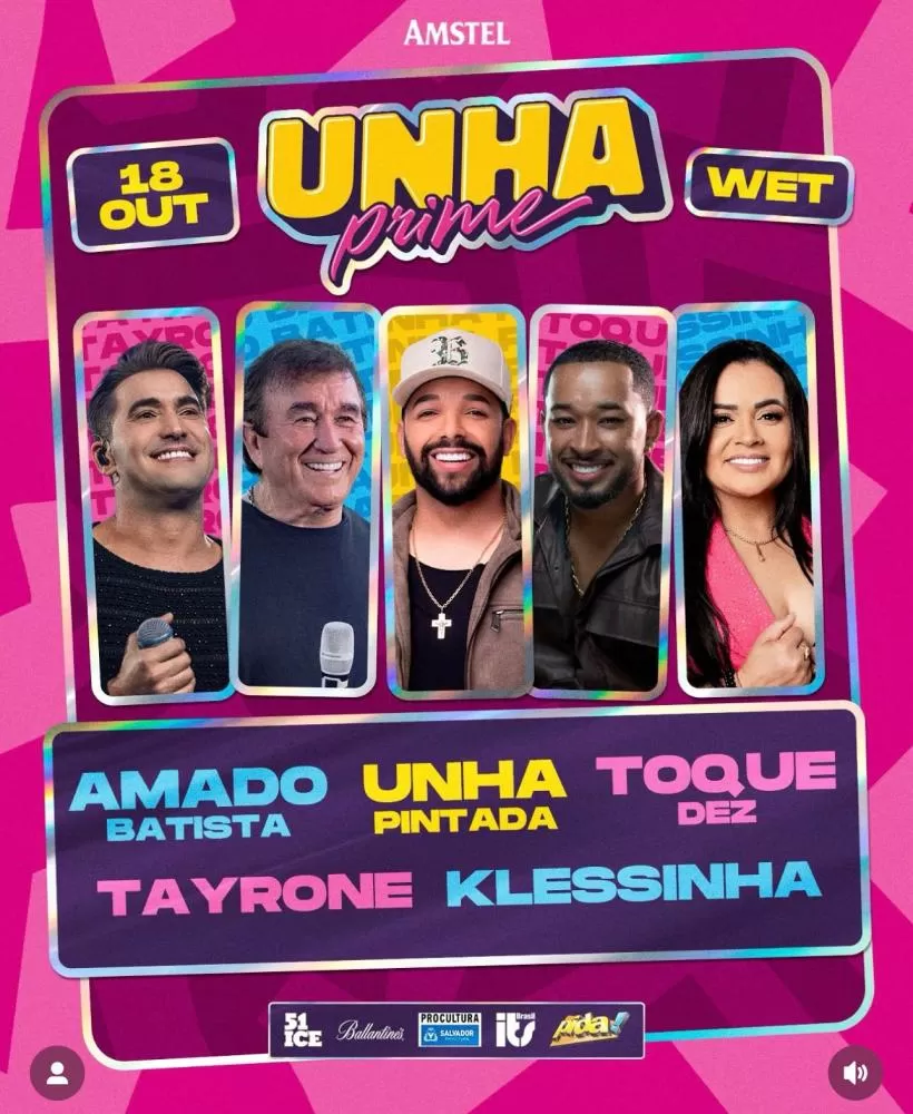 O arrocha e o brega vão tomar conta de Salvador neste sábado (18)! O Unha Prime – um evento exclusivo que promete uma noite inesquecível de pura emoção e paixão vai receber grandes nomes do cenário da música, transformando o palco do Wet Salvador em uma atmosfera de muita música e sentimento.