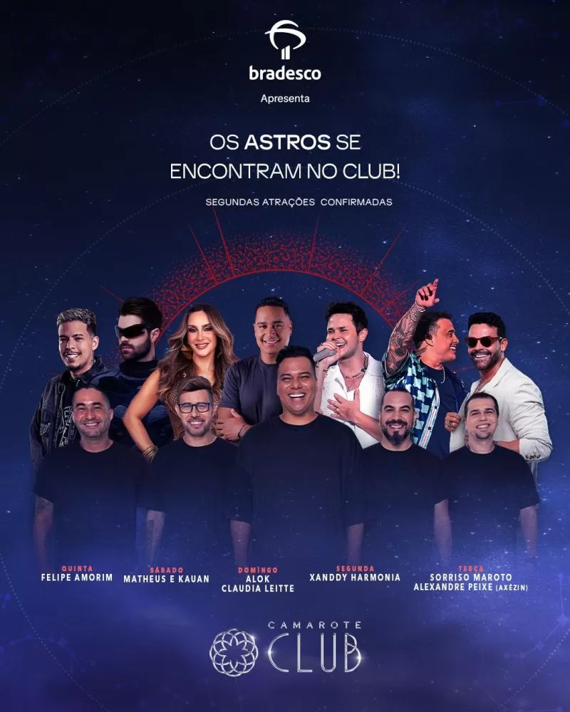 Além das novas confirmações, o Camarote Club já havia anunciado Henry Freitas e Natanzinho Lima (quinta-feira), Wesley Safadão e o grupo Menos É Mais (sexta-feira), a batida percussiva da Timbalada (sábado), o romantismo de Thiaguinho (segunda-feira) e, para fechar com chave de ouro, o GG Léo Santana (terça-feira).