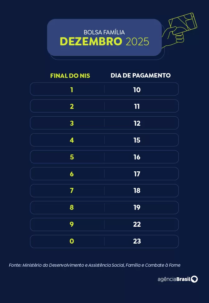 No modelo tradicional do Bolsa Família, o pagamento ocorre nos últimos dez dias úteis de cada mês. No entanto, por causa das festas de fim de ano, o calendário de dezembro é antecipado em cerca de dez dias, para dar tempo de os benefícios serem depositados antes do Natal.