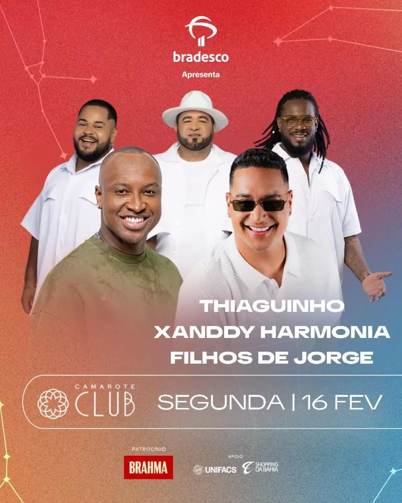 Além de Thiaguinho, Xanddy Harmonia e Filhos de Jorge, o Camarote Club receberá também Henry Freitas, Natanzinho Lima e Felipe Amorim (quinta-feira), Wesley Safadão e Menos É Mais (sexta-feira), a dupla Matheus & Kauan, o romantismo de Belo e o som percussivo da Timbalada (sábado), o charme de Claudia Leitte e as batidas eletrônicas de Alok (domingo) e, encerrando a folia, na terça-feira GG Léo Santana, Sorriso Maroto e Alexandre Peixe com o projeto Axézin.