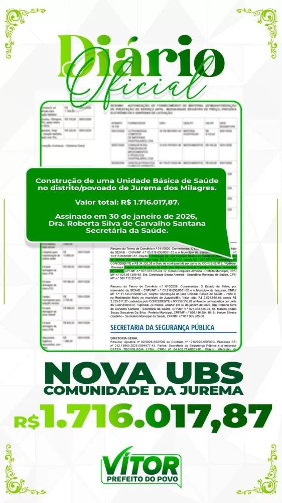 O anúncio da nova UBS para a comunidade da Jurema foi feito pelo prefeito Vitor do Posto, por meio de suas redes sociais. CLIQUE AQUI.