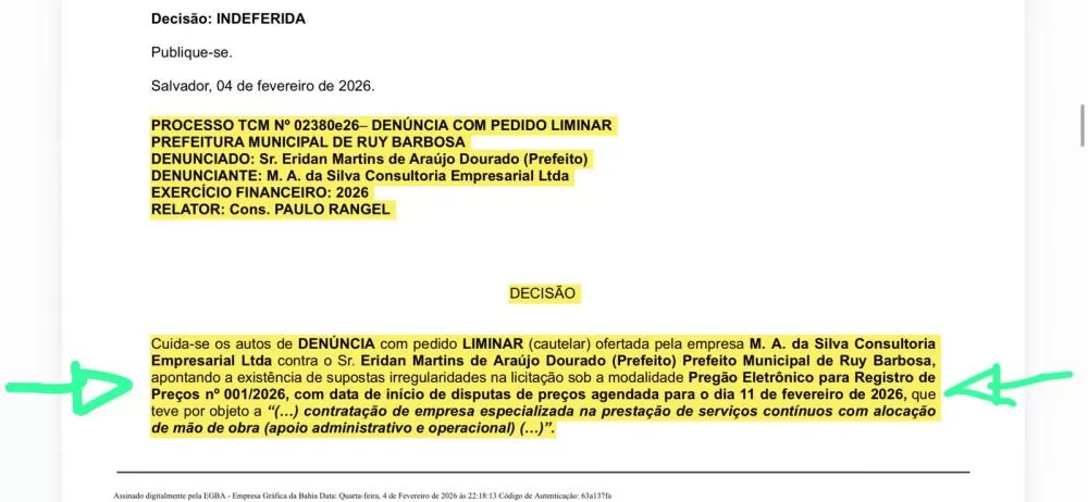O Tribunal de Contas dos Municípios da Bahia determinou a suspensão imediata de uma licitação da Ruy Barbosa, após identificar fortes indícios de irregularidades em edital conduzido pela gestão da prefeita do município. A decisão liminar foi publicada no Diário Oficial do TCM no dia 5 de fevereiro.