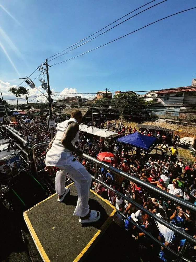 O “Príncipe do Gueto” comandou o percurso com a energia e irreverência que marcam seus shows, levando milhares de pessoas atrás do trio sem cordas e transformando o trajeto em uma grande celebração popular.