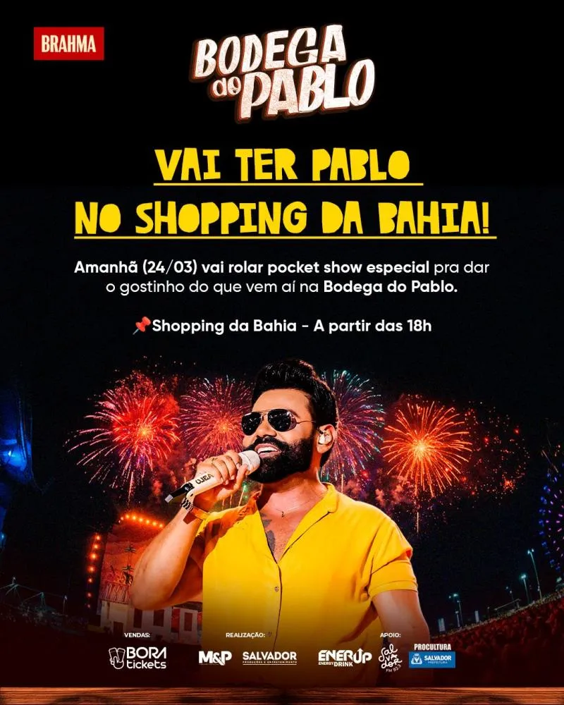 O clima de arrocha, sofrência e romantismo vai invadir o Shopping da Bahia no dia 24 de março. Em um pocket show exclusivo com Pablo, a ‘Bodega do Pablo’ promove um aquecimento especial para apresentar ao público toda a essência do que vai acontecer no dia 11 de abril, no Wet Eventos.